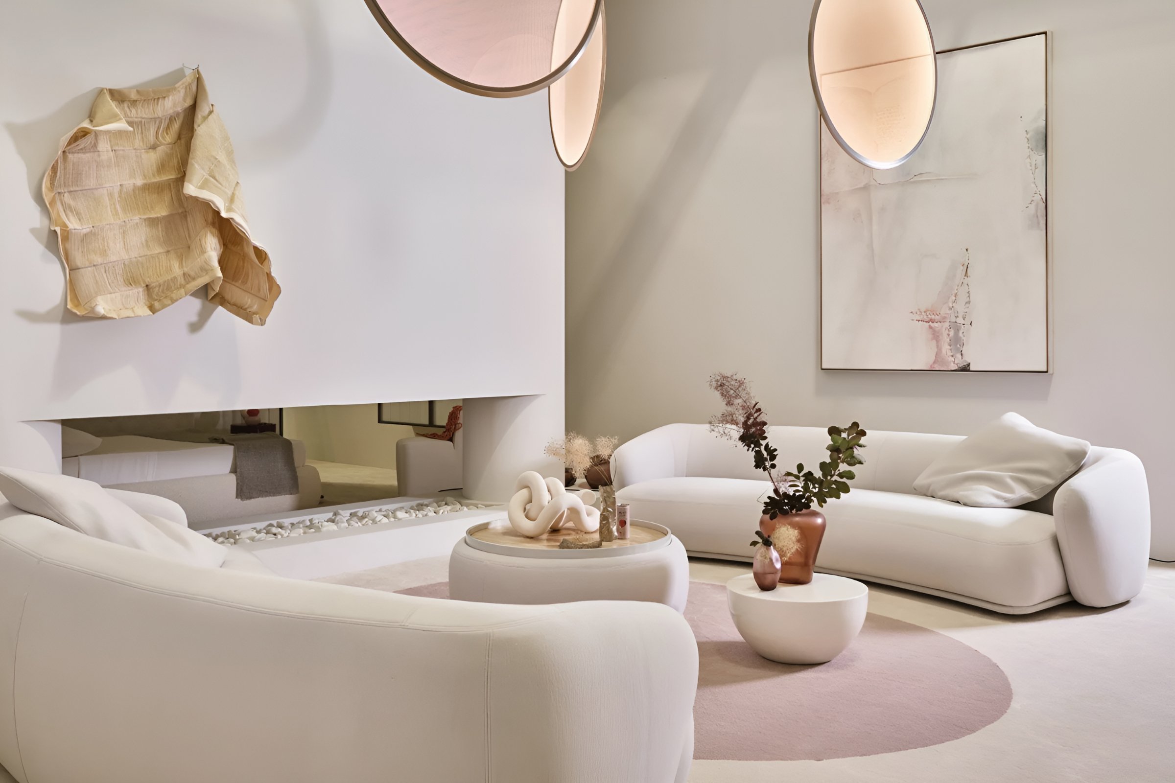 Центральное место в гостиной занимает мягкая мебель. Ее расположение, стиль, цвет задает настроение всей комнате. Диваны могут быть прямой, угловой, изогнутой формы. Такое решение позволяет расположить эти предметы интерьера в любом порядке. В качестве обивки мягкой мебели применяются исключительно натуральные материалы, которые не вызовут аллергических реакций у гостей. Это может быть натуральная кожа животных (в плоть до эксклюзивных), дорогие ткани. В основном используются нейтральные однотонные цвета с интересной фактурой. Такая мебель приятна на ощупь и располагает к отдыху. Наполнители также имеют гипоаллергенные свойства. Часто это натуральный пух, перо, войлок.