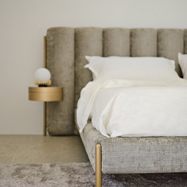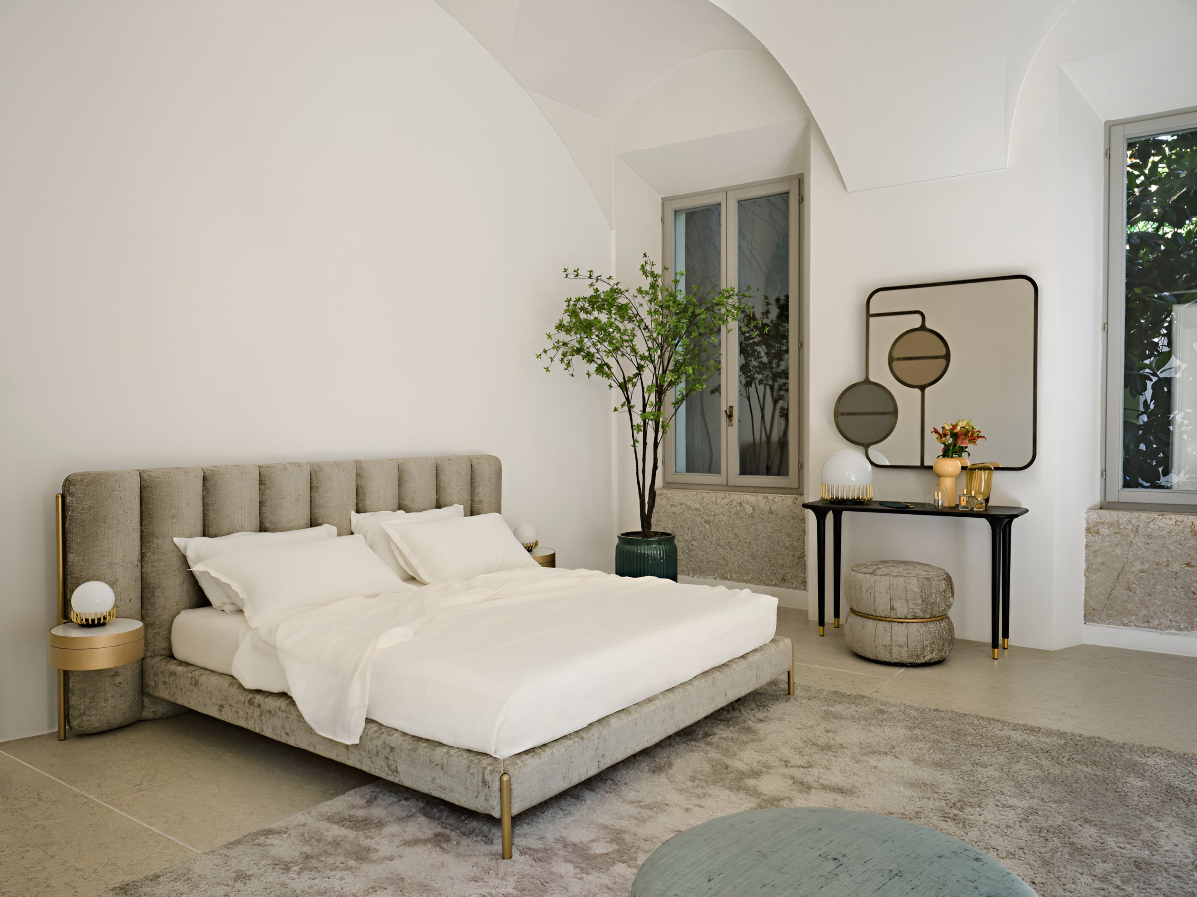 Матовое золото незаметно обрамляет детали линий и интеллектуальную встроенную прикроватную систему, которая скрывает в маленьком вращающемся ящике самые ценные секреты. Отделка задней лакированной стеклянной столешницы гармонирует с тканью изголовья, контрастом или аккордом, в соответствии с вашим характером.