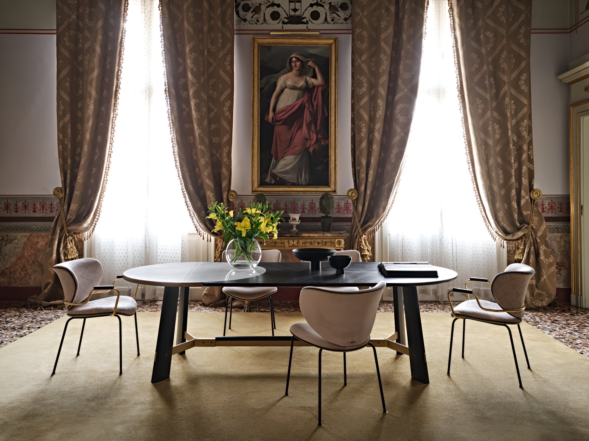 Подставка для ног из матового золота подчеркивает и гармонизирует элегантность этого стола, который с изысканной простотой вписывается в жилую, контрактную и офисную среду.