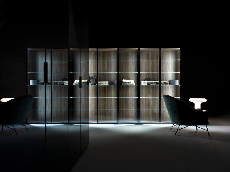 Различные типы ручек позволяют получить доступ к содержимому удобным и прямым способом. Бесшумное и плавное закрытие благодаря шарнирам со встроенным амортизатором. В двухтактном варианте алюминиевая выемка облегчает захват створки. Закрытая композиция придает стене непрерывность и эстетическую чистоту. Модульная дверь может быть объединена с внешними ящиками, дневными отсеками и складками для создания динамической геометрии, игры отделки и цвета. Одинарная или двойная, распашная створка всегда интегрируется с дизайном шкафа на сантиметр.