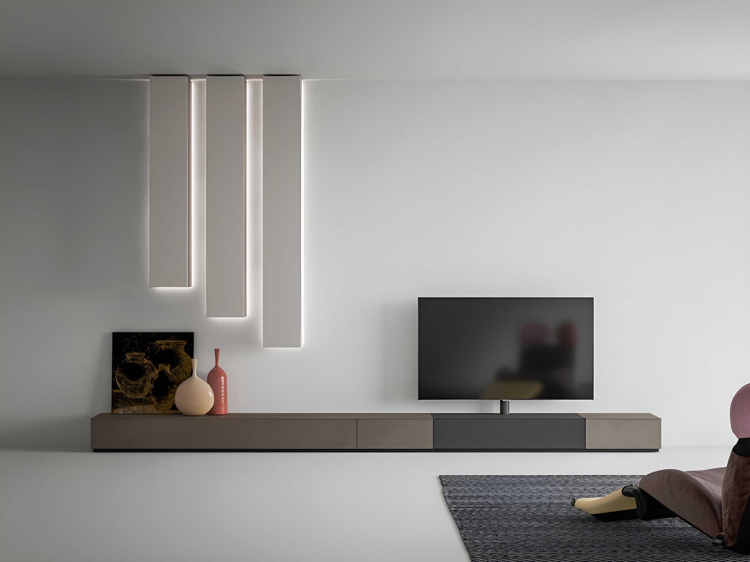 Система Wallover предлагает различные решения для управления телевизором и всеми аксессуарами, которые дополняют его сегодня. В этой композиции четыре наземных модуля объединяются, образуя напряженную горизонтальную линию. Один из них, называемый Fibra multimedia, поставляется с подставкой для телевизора с колонкой кабельных вводов, в которой можно разместить декодеры, звуковые панели и многое другое. Это решение для гостиной управляется тремя колоннами, которые спускаются с потолка на разные высоты и подчеркивают ритм стены. Светодиодные спинки, нанесенные на заднюю часть колонн, подчеркивают их силуэт, подчеркивая динамизм этой скульптуры.