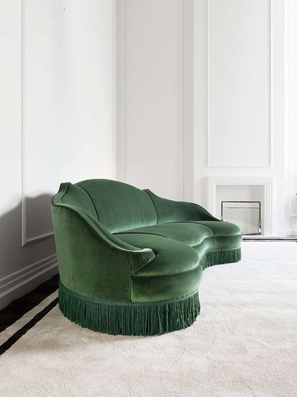 Уникальная и изогнутая форма его конструкции, покрытой изысканной тканью, имеет закруглённые и мягкие углы и дополнена очаровательным декором в виде бахромы, которая создаёт удивительное ощущение движения под сиденьем.