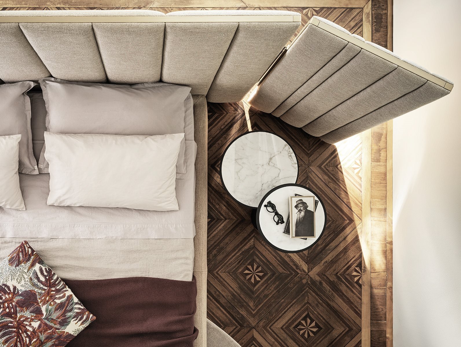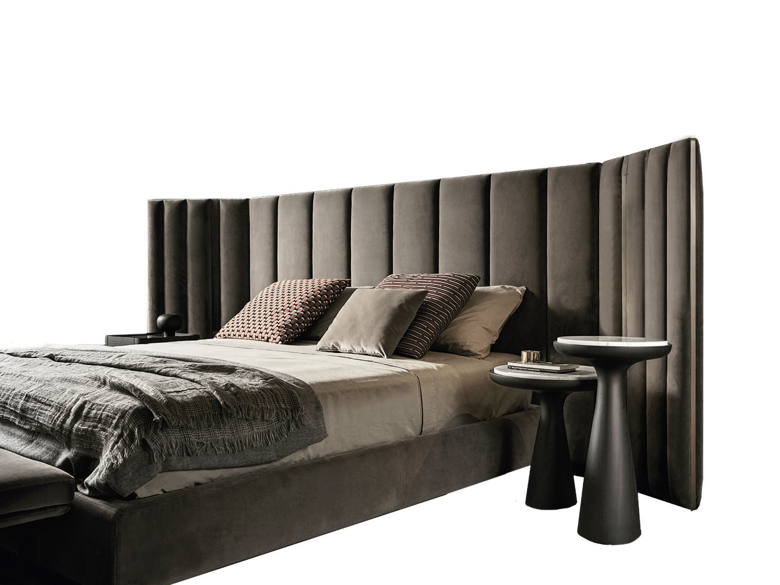 Отдельно стоящее мягкое изголовье с регулируемыми боковыми панелями. В комплекте деревянные рейки. Доступно покрытие из ткани или кожи в соответствии с образцами. Детали из матовой латуни или непрозрачной черной лакированной латуни. Версия с USB-портами для зарядки (по одному с каждой стороны) по запросу. Для элементов с кожаной обивкой требуется дополнительная строчка по сравнению с элементами с тканевой обивкой.