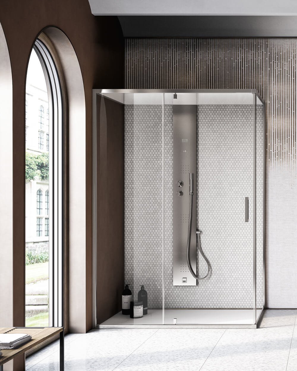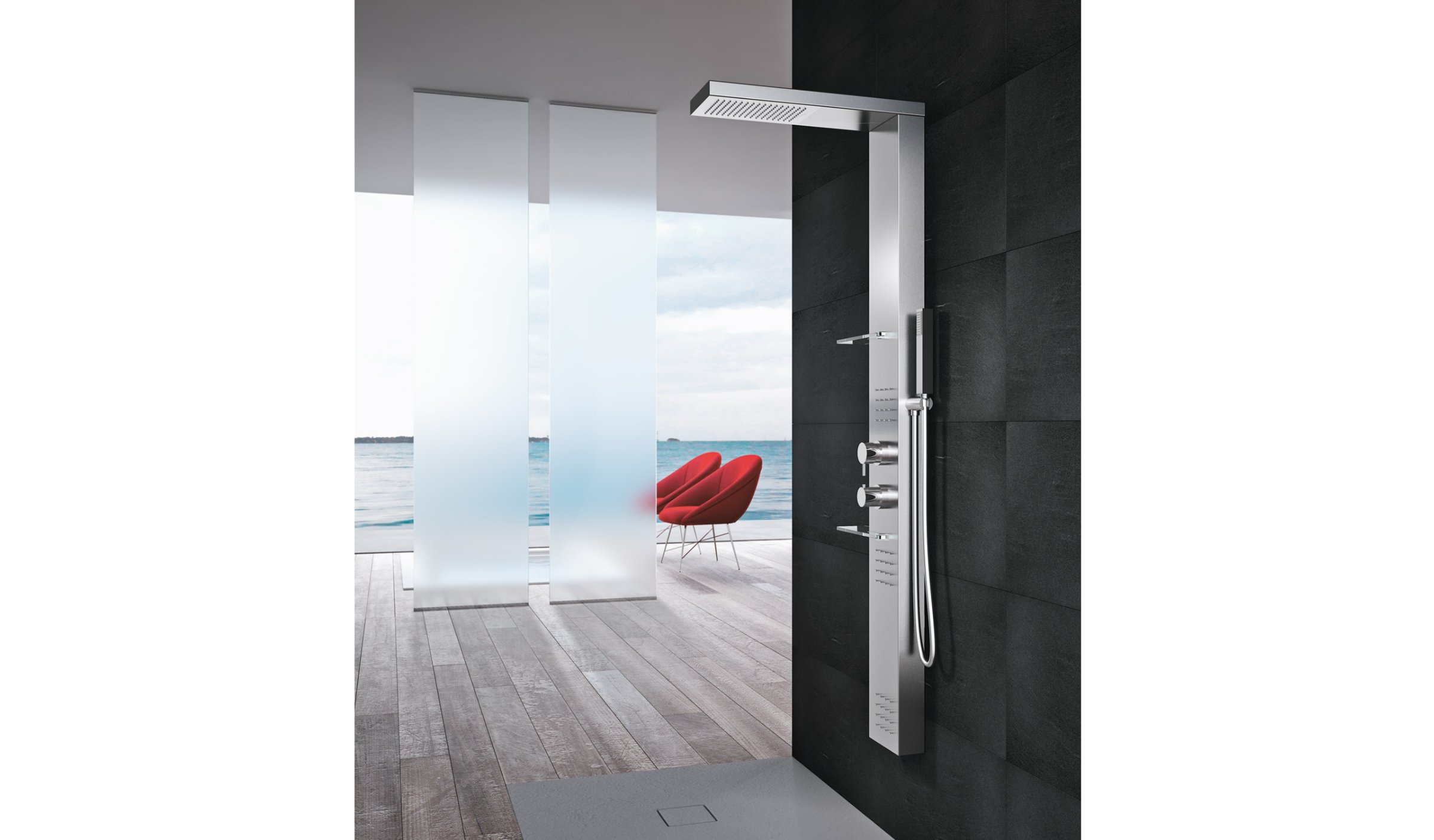 Многофункциональная душевая колонна Bridge Plus из нержавеющей стали имеет важное значение в дизайне и обладает полной функциональностью: встроенная душевая головка, термостатический смеситель, дождевой душ, две полки для хранения и три гидромассажные насадки для всех видов отдыха.