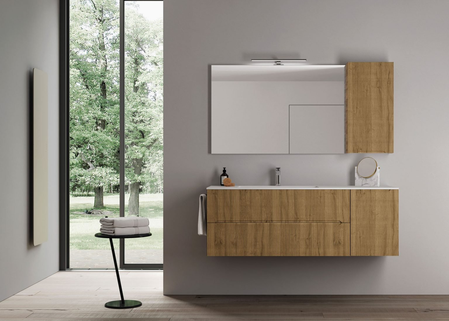System-это программа, характеризующаяся напольной или подвесной мебелью для ванной комнаты с отличной вместимостью , доступной в широком диапазоне отделок и комбинируемой с различными предложениями раковины (в опоре или интегрированной), небольшой глубиной (до 38,5 см) для удовлетворения потребностей, связанных с управлением пространством и ручкой декомпозиционная горловина в трех вариантах отделки (белый, матовый черный, хром) для согласованного предложения.