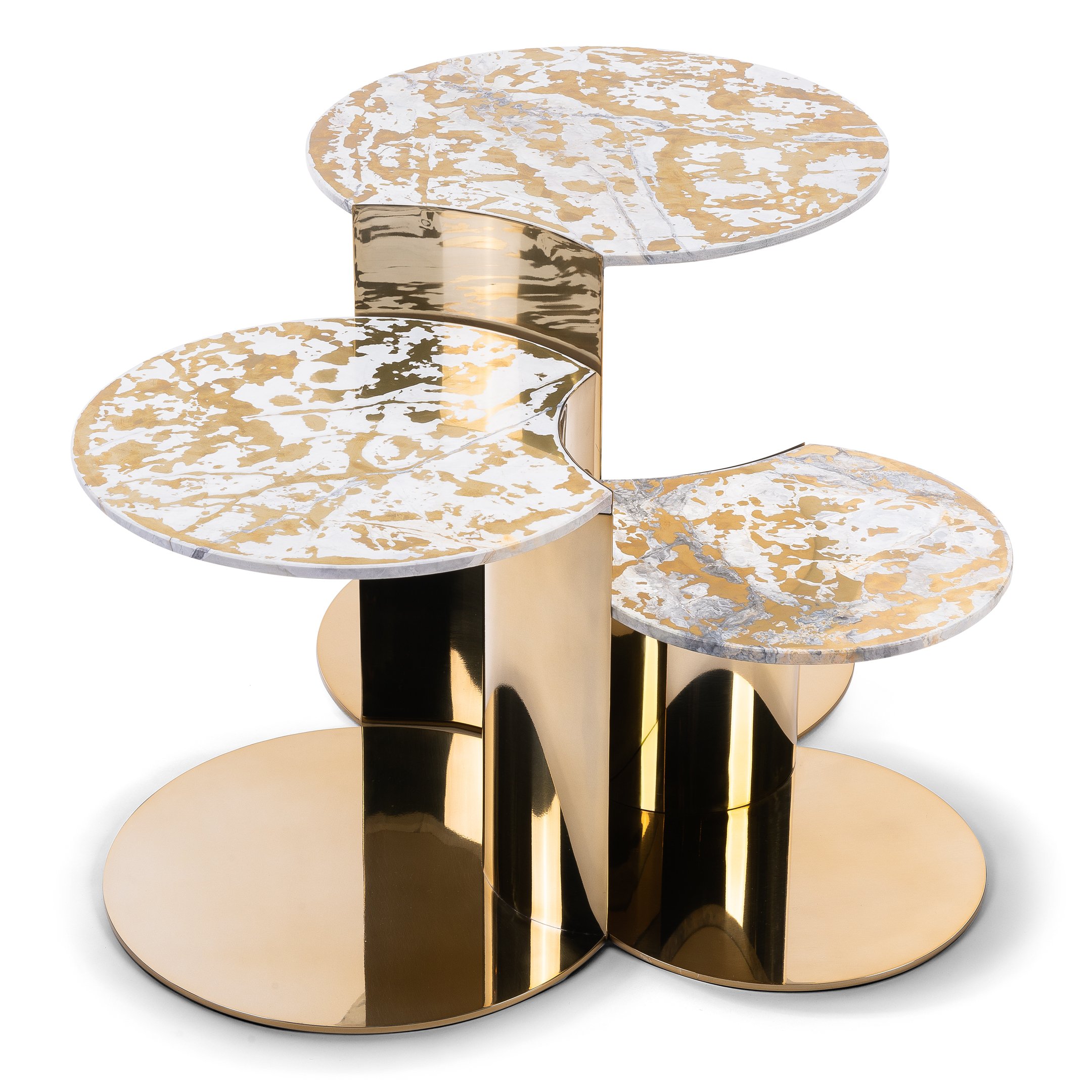 Ножка из полированной стали смещена от центра, вогнутая часть переходит в аналогичную по форме мраморную столешницу. Столешница из полированного мрамора с граненой отделкой нижнего края. Возможна опция “invisible grey marble - leather nishing” с обработкой поверхности золотым, бронзовым или марганцевым лаком. Металлические детали, которые также можно приобрести отдельно, доступны в различных видах глянцевой отделки. Дополнительный вариант: декорирование жидким золотом с восковой полировкой для мрамора Invisible Grey, Black & Gold, Ivory Onyx, Velvet Onyx.