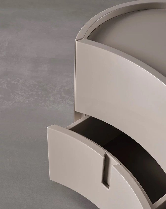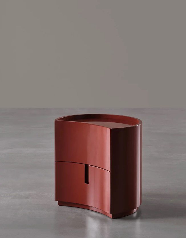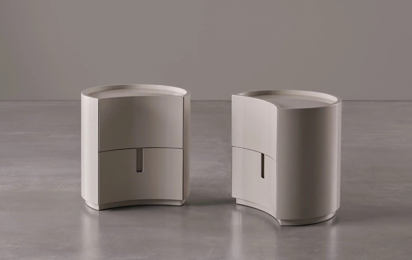 Johnny — это цилиндрический прикроватный столик с двумя ящиками, с вогнутой передней частью и опущенной верхней частью, которая может быть выполнена из глянцевого или матового лака — как и рама, — а также из мрамора. Чтобы дополнить коллекцию, на существующую верхнюю часть можно надеть чехол из натуральной кожи.