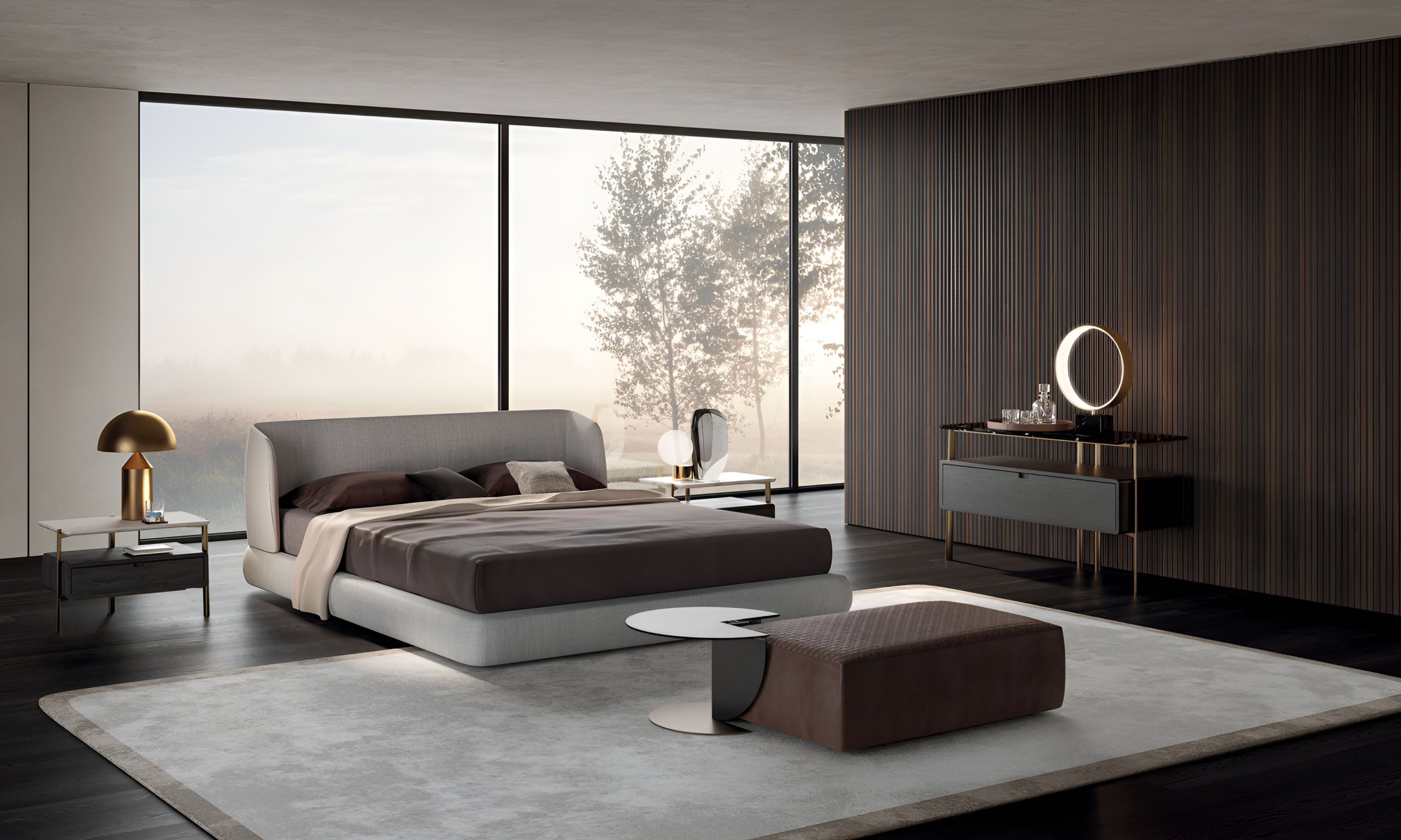 Архитектурные профили подчеркивают мягкие объемы и в то же время создают легкий графический акцент. Доступна с местом для хранения или без него, в разных размерах. Отличается обволакивающим изголовьем, выполненным из ткани или кожи.