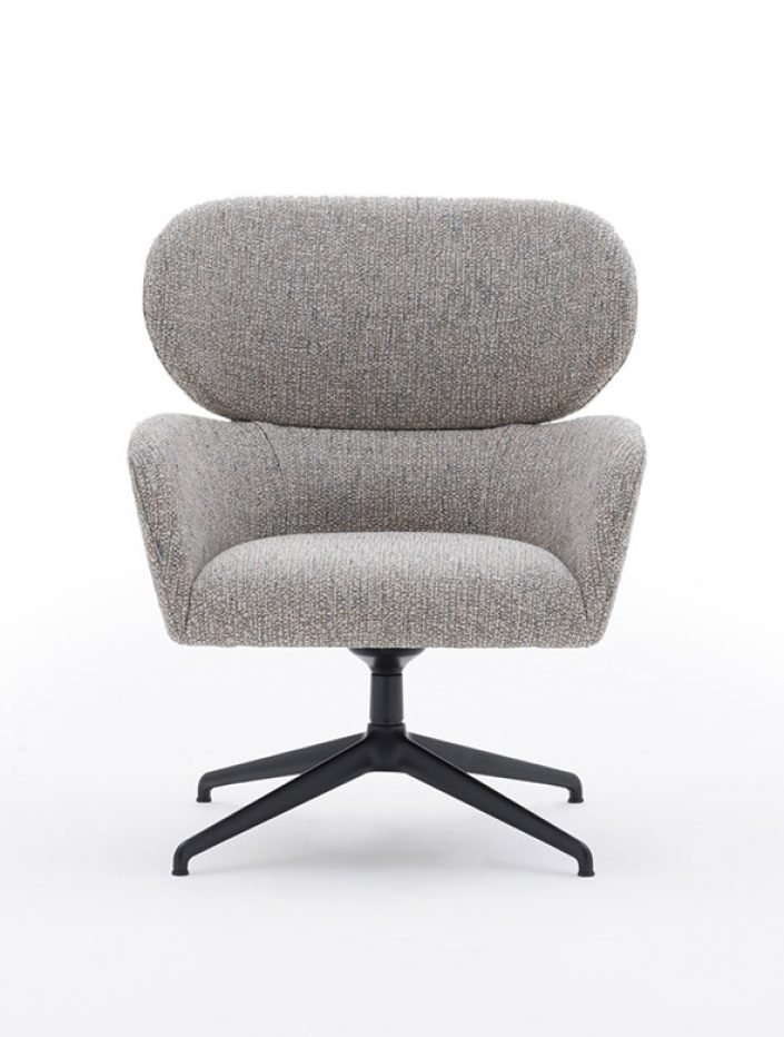 Кресло, каркас сиденья с закругленными краями. Корпус с двумя пенопластовыми элементами. Перепончатое сиденье. Обивка на каркасе. Поворотное алюминиевое основание с 4 спицами.