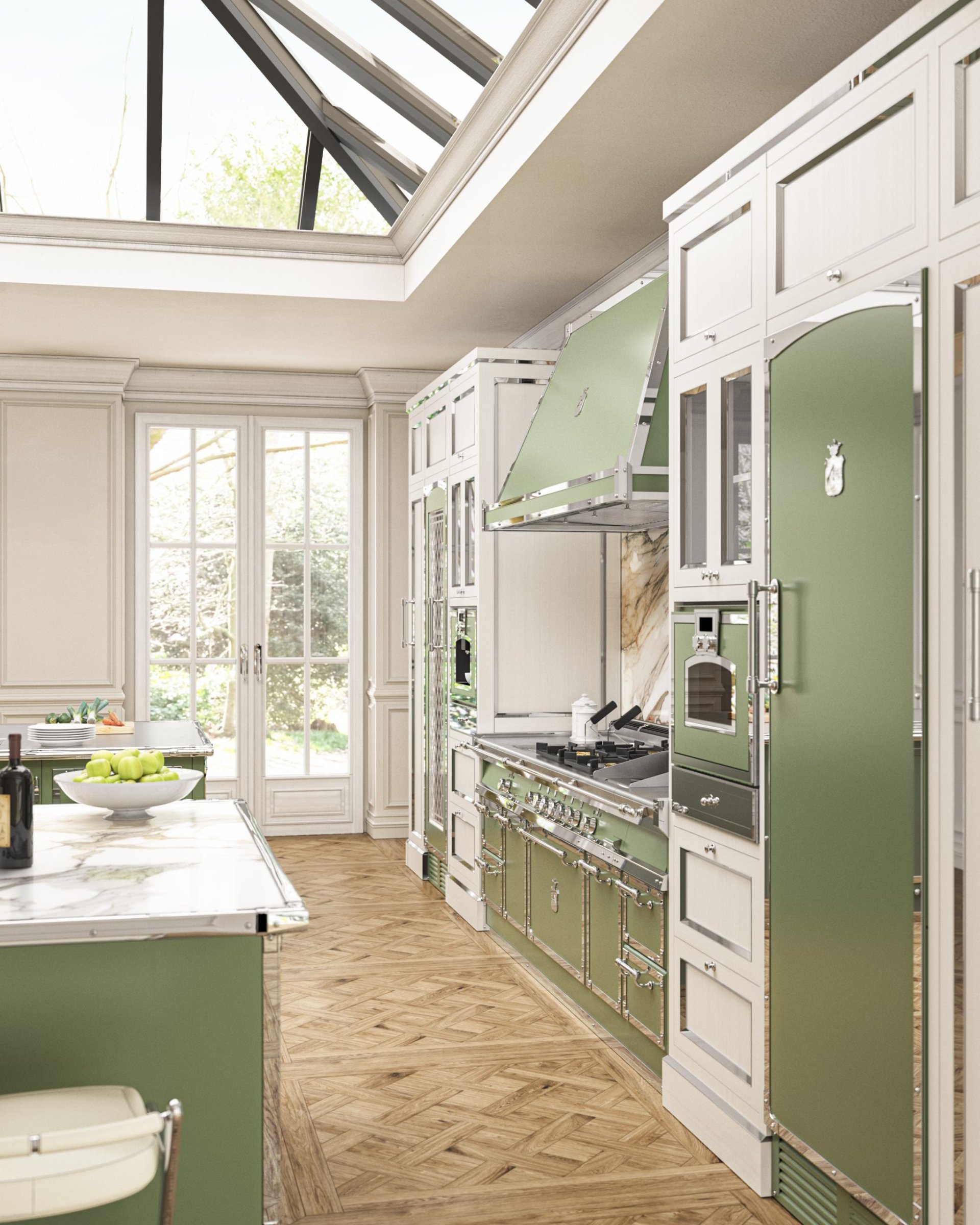 Этот индивидуальный проект состоит из индивидуальной машины для приготовления пищи, колонны бытовой техники, состоящей из двух духовок, подогревателя пищи, кофейной машины и холодильника. Все это стоит перед двумя островами, которые занимают центральное пространство кухни, точно под стеклянным приамидом, освещающим всю комнату.