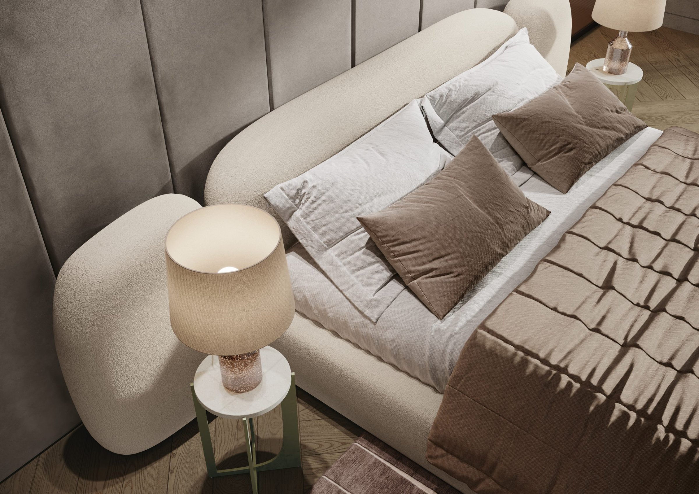 Каркас и ножки кровати изготовлены из экологически чистого массива ясеня, а мягкое изголовье и каркас кровати — из органического каучука и натурального наполнителя. Даже обивка из букле-шерсти имеет натуральную и экологичную основу. Кровать VAO оснащена двумя подвижными боковыми «крыльями», которые закрывают прикроватные тумбочки.