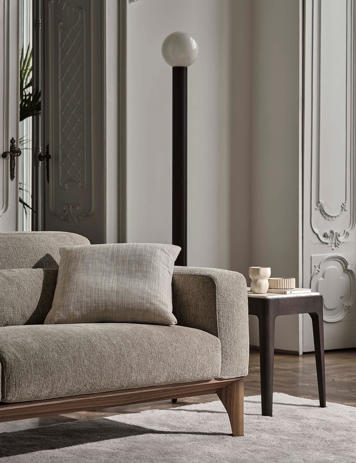 Детали, подчеркивающие тонкий пошив, объединяющий всю коллекцию, — это, несомненно, слегка контрастная рельефная строчка, украшающая края подушек сиденья и спинки, а также подлокотники и мягкую основу.