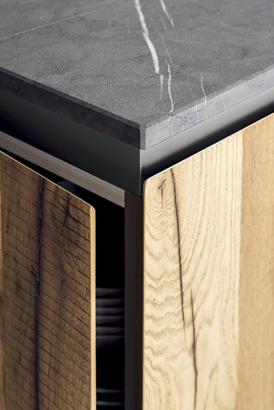 Тщательно подобранные натуральные материалы сочетаются с оригинальной отделкой и деталями. Качество дизайна позволяет создать уникальный стиль, гармонирующий с пространством. Большой остров становится центром домашней жизни. Изысканная и продуманная естественность, способная придать пространству сбалансированную индивидуальность, в основе которой лежат самые интимные материалы. Решение, подходящее для открытых пространств, для архитектурных решений, характеризующихся новыми образами и размерами. Модель T45, использованная в этой композиции, обеспечивает максимальную композиционную гибкость и свободу в выборе отделки.