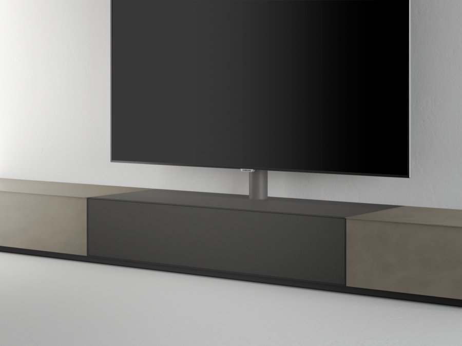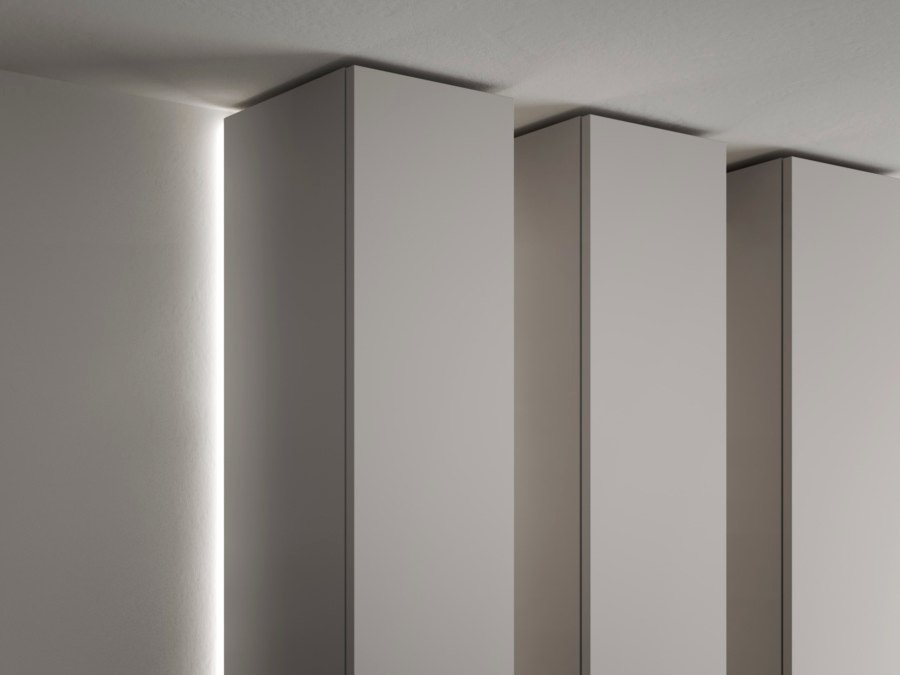 Система Wallover предлагает различные решения для управления телевизором и всеми аксессуарами, которые дополняют его сегодня. В этой композиции четыре наземных модуля объединяются, образуя напряженную горизонтальную линию. Один из них, называемый Fibra multimedia, поставляется с подставкой для телевизора с колонкой кабельных вводов, в которой можно разместить декодеры, звуковые панели и многое другое. Это решение для гостиной управляется тремя колоннами, которые спускаются с потолка на разные высоты и подчеркивают ритм стены. Светодиодные спинки, нанесенные на заднюю часть колонн, подчеркивают их силуэт, подчеркивая динамизм этой скульптуры.