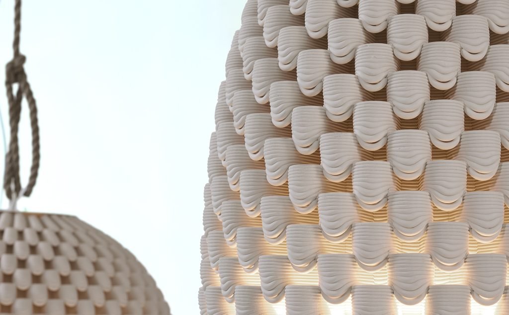 Впервые в секторе элитной мебели керамогранит используется в качестве материала для 3D-печати, что позволяет создавать уличные фонари, излучающие тёплый и успокаивающий свет. После печати и высыхания материал естественным образом складывается, образуя прорези, через которые пробиваются нежные лучи света. Изысканный дизайн сочетается с природными свойствами материала, создавая долговечную систему освещения, которая позволяет расслабиться на свежем воздухе. Эта подвесная лампа доступна в двух вариантах: более вытянутой и конической формы или более низкой и широкой.