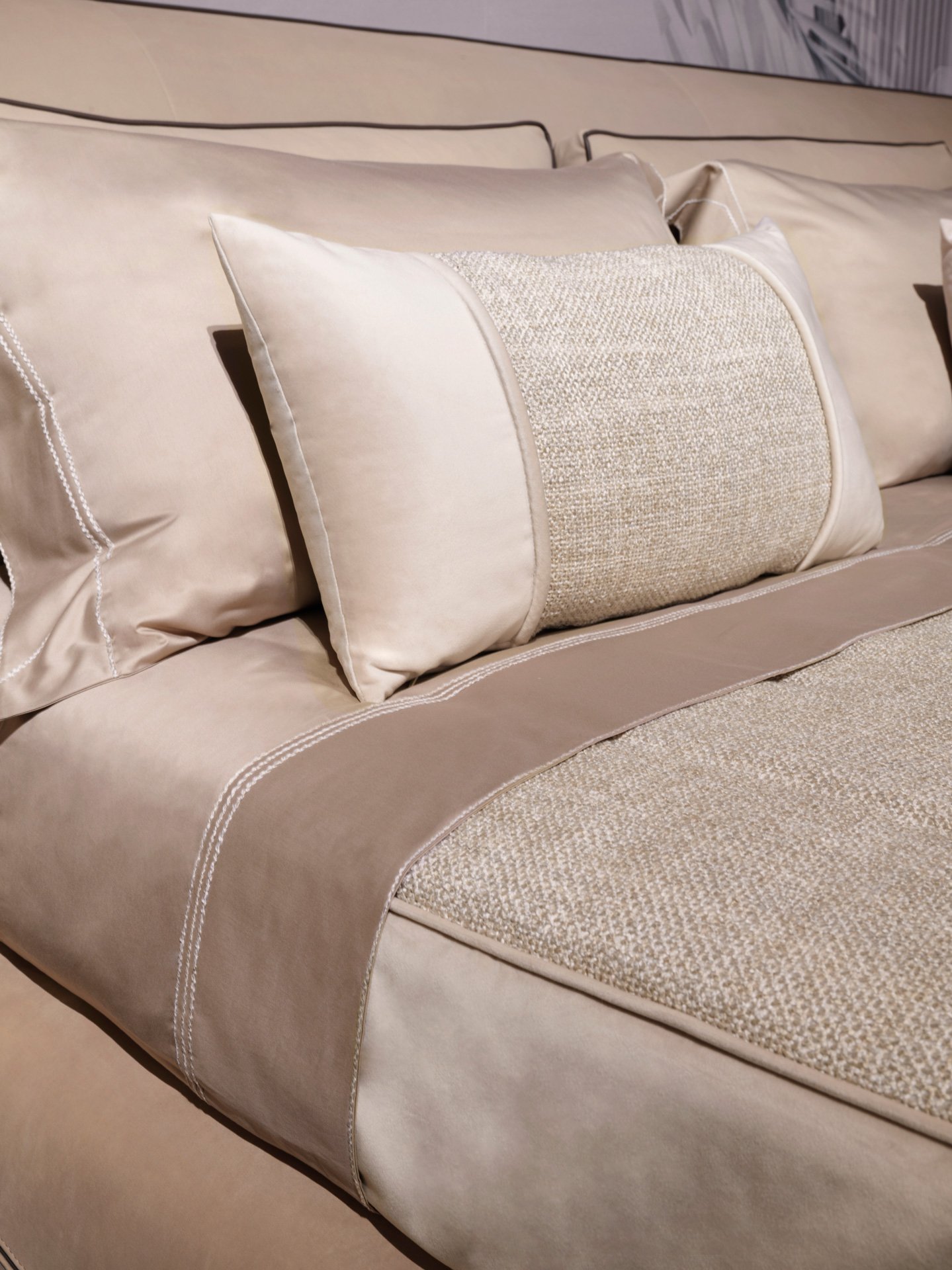 Фигурное мягкое изголовье украшено декоративными вставками из кожи контрастного оттенка. В комплект входят две декоративные подушки в аналогичной отделке с перьевым наполнением. Сомье состоит из трех элементов в индивидуальной обивке с декоративными контрастными кожаными вставками по периметру. Сомье украшено декоративными элементами с двойной отделкой из алюминия и матовой нержавеющей стали (доступны различные варианты металлической отделки). Кровать предназначена для опоры реечного основания из дерева с угловыми креплениями и центральной перекладиной из окрашенной стали; регулируемая высота. Доступно в комплектации со светодиодным светильником, установленным под верхним профилем изголовья. Можно комбинировать с комплектом постельного белья, подушками и покрывалом Mirabell.