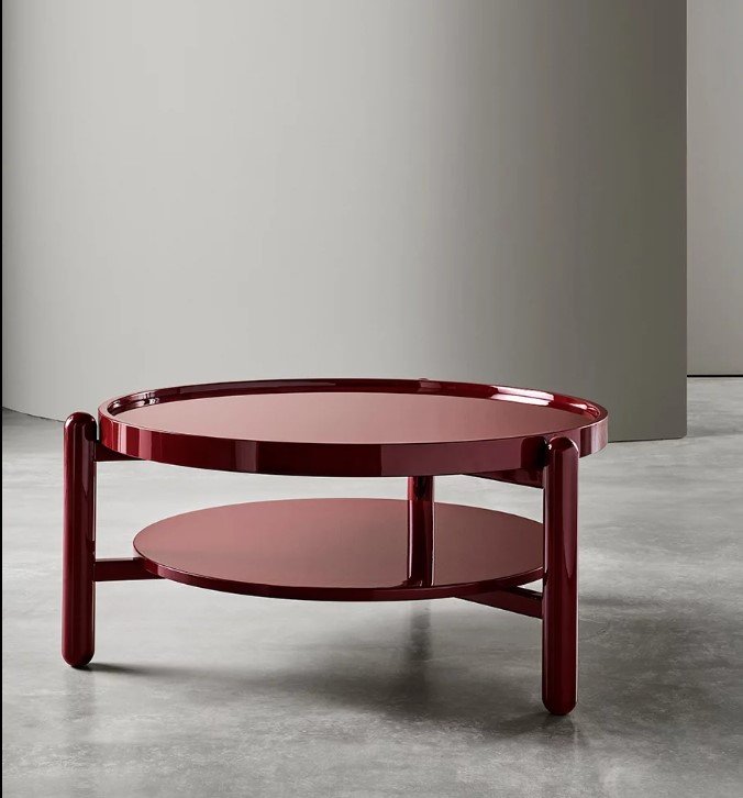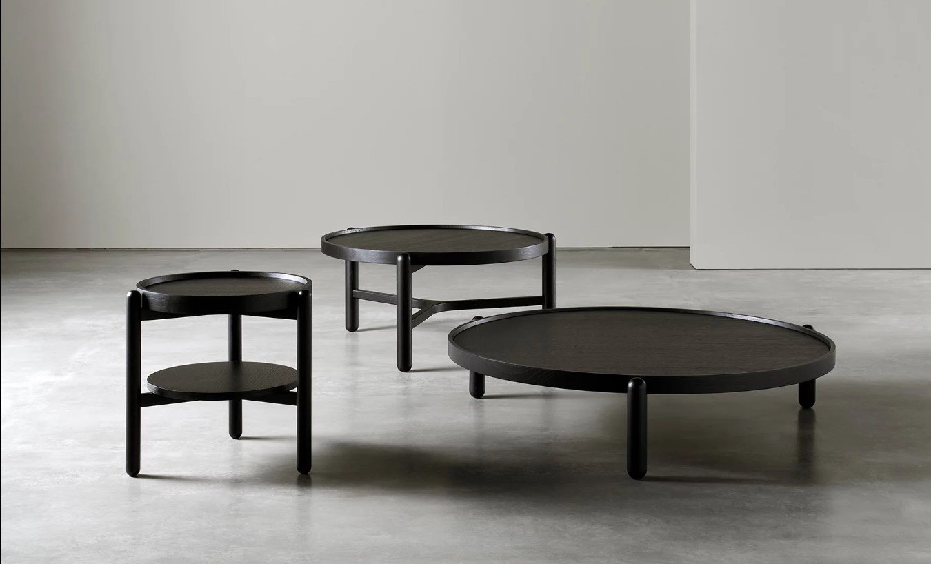 Каркас из массива дерева выполнен таким образом, чтобы создавать визуальную гармонию; он предлагается в различных цветовых решениях — табачном, черном, белом или светлом — или с глянцевым или матовым лаковым покрытием. Аккуратные, простые формы подчёркиваются столешницей — круглым подносом, на котором лежит столешница из окрашенного стекла, мрамора или дуба. Различные материалы и дополнительная нижняя столешница делают это изделие чрезвычайно универсальным, а также позволяют сочетать цветовые решения тон в тон или с контрастными комбинациями, чтобы придать ему более классический или декоративный вид.