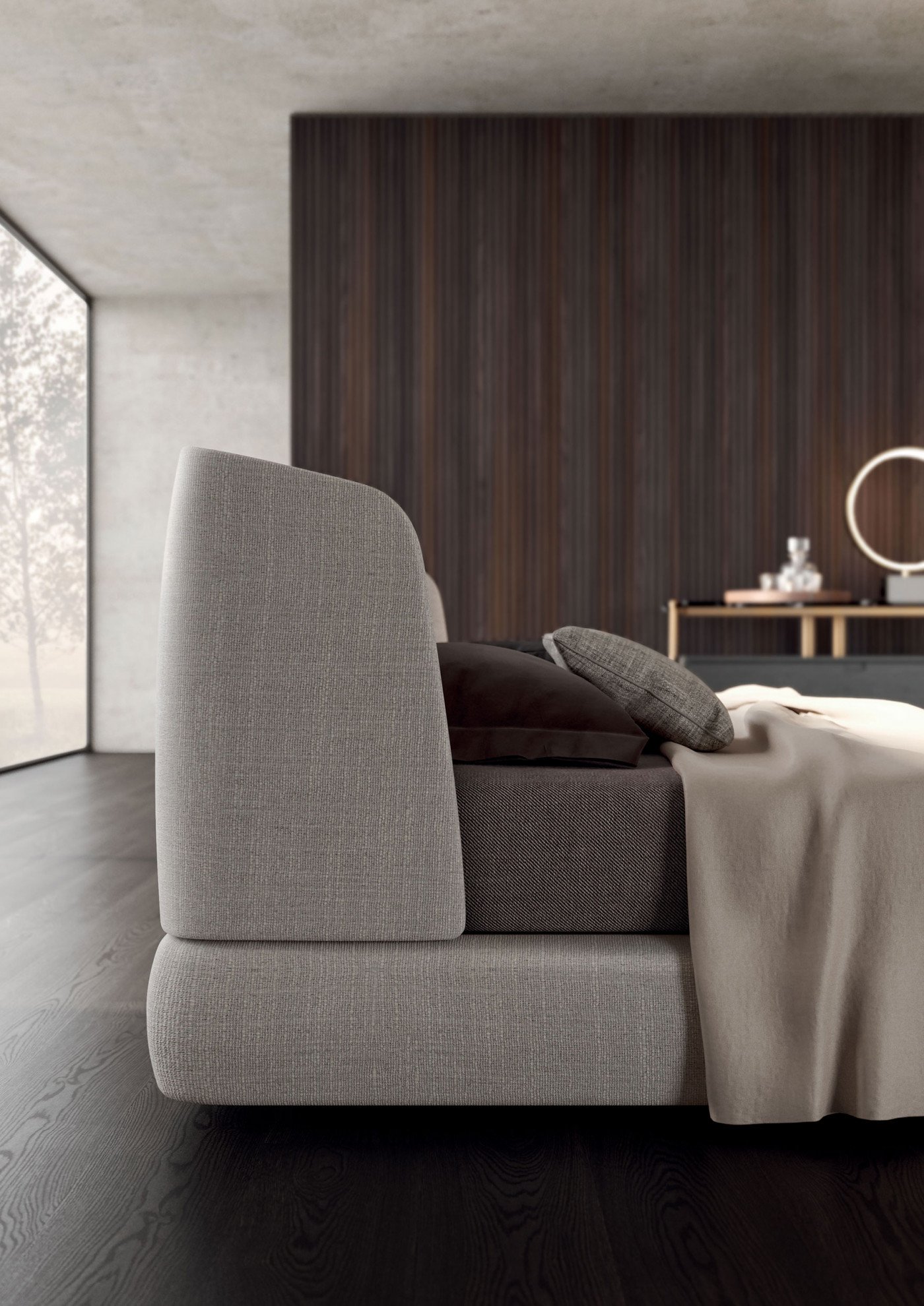 Архитектурные профили подчеркивают мягкие объемы и в то же время создают легкий графический акцент. Доступна с местом для хранения или без него, в разных размерах. Отличается обволакивающим изголовьем, выполненным из ткани или кожи.