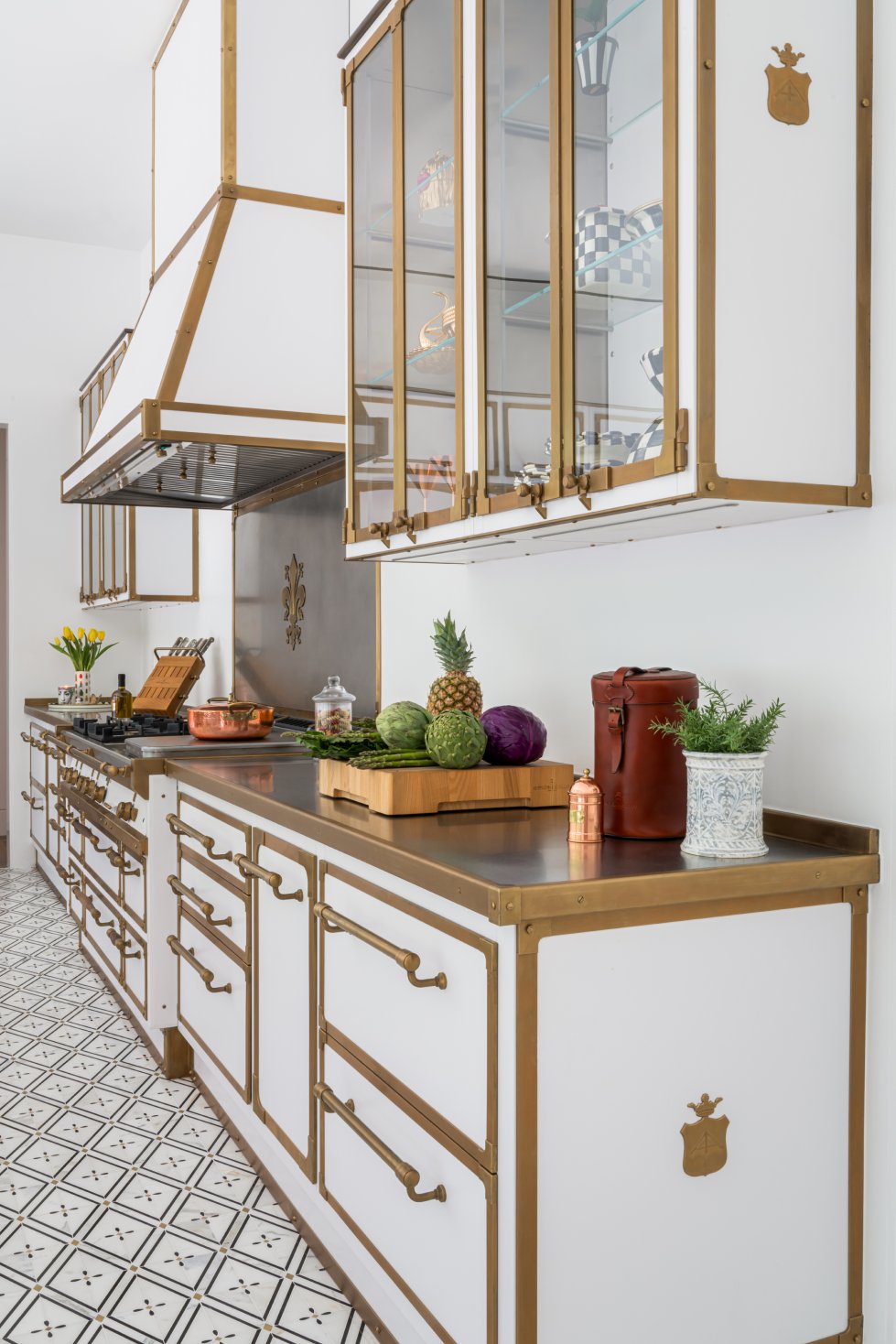 Остров имеет столешницу из нержавеющей стали и врезную раковину с двойным смесителем. Под столешницей находятся посудомоечная машина, выдвижные ящики, шкафы и глубокие ящики. Главная стена отведена под приготовление пищи и оснащена варочной панелью на 8 конфорок, гладкой поверхностью для жарки и вытяжкой. Под варочной панелью находится набор ящиков с деревянными разделителями для столовых приборов, специй, бутылок и посуды. Над ними возвышается панель из матовой стали и вытяжной шкаф в форме пирамиды, по бокам от которых расположены два открытых шкафа с подсветкой и стеклянными полками. На боковой стене расположены холодильник с морозильной камерой, многофункциональная духовка и микроволновая печь, а над ними — отделения для хранения.