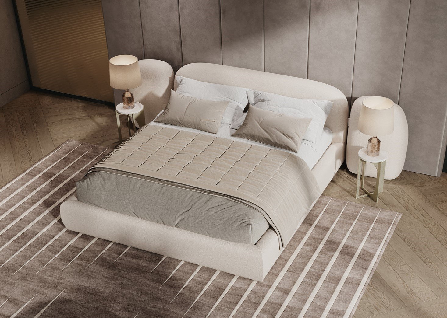Каркас и ножки кровати изготовлены из экологически чистого массива ясеня, а мягкое изголовье и каркас кровати — из органического каучука и натурального наполнителя. Даже обивка из букле-шерсти имеет натуральную и экологичную основу. Кровать VAO оснащена двумя подвижными боковыми «крыльями», которые закрывают прикроватные тумбочки.