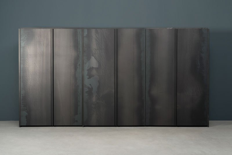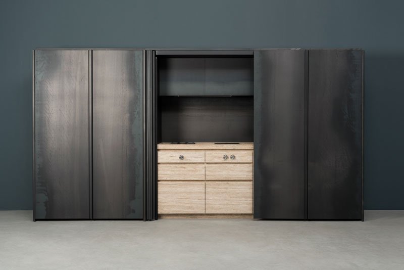 Вся функциональность и дизайн кухни Vaselli скрыты за простой и элегантной раздвижной стеной из стального листа, которая открывается и закрывается одним движением руки.