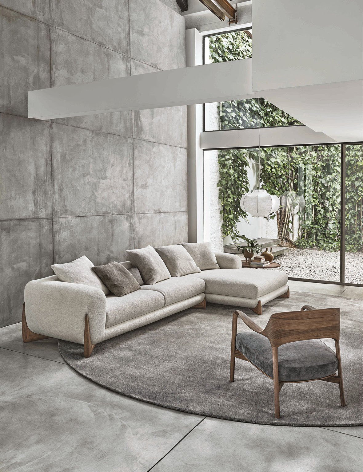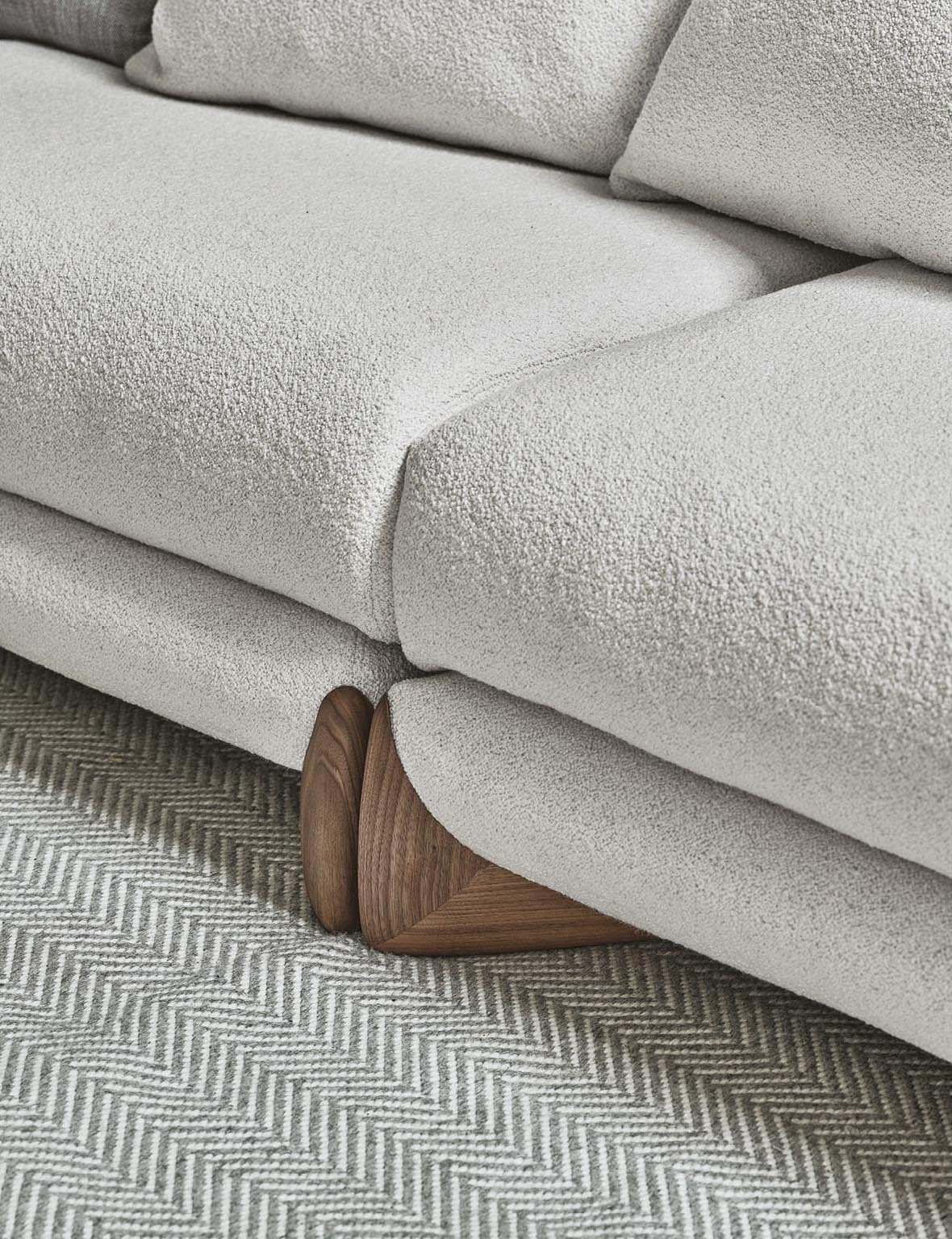 Расположенные близко к четырем углам, ножки из орехового массива Canaletta навязывают себя, определяя концы этих элементов мебели и напоминая форму скрепки. Они классифицируются как отличительные, несущие и удерживающие элементы мягкой формы, которая без них имела бы тенденцию к расширению наружу.
