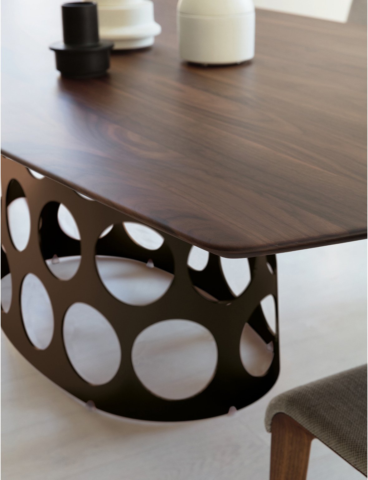 Кроме того, его центральное положение по отношению к столешнице обеспечивает большую гибкость, оставляя полную свободу в расстановке обеденных стульев вокруг стола.