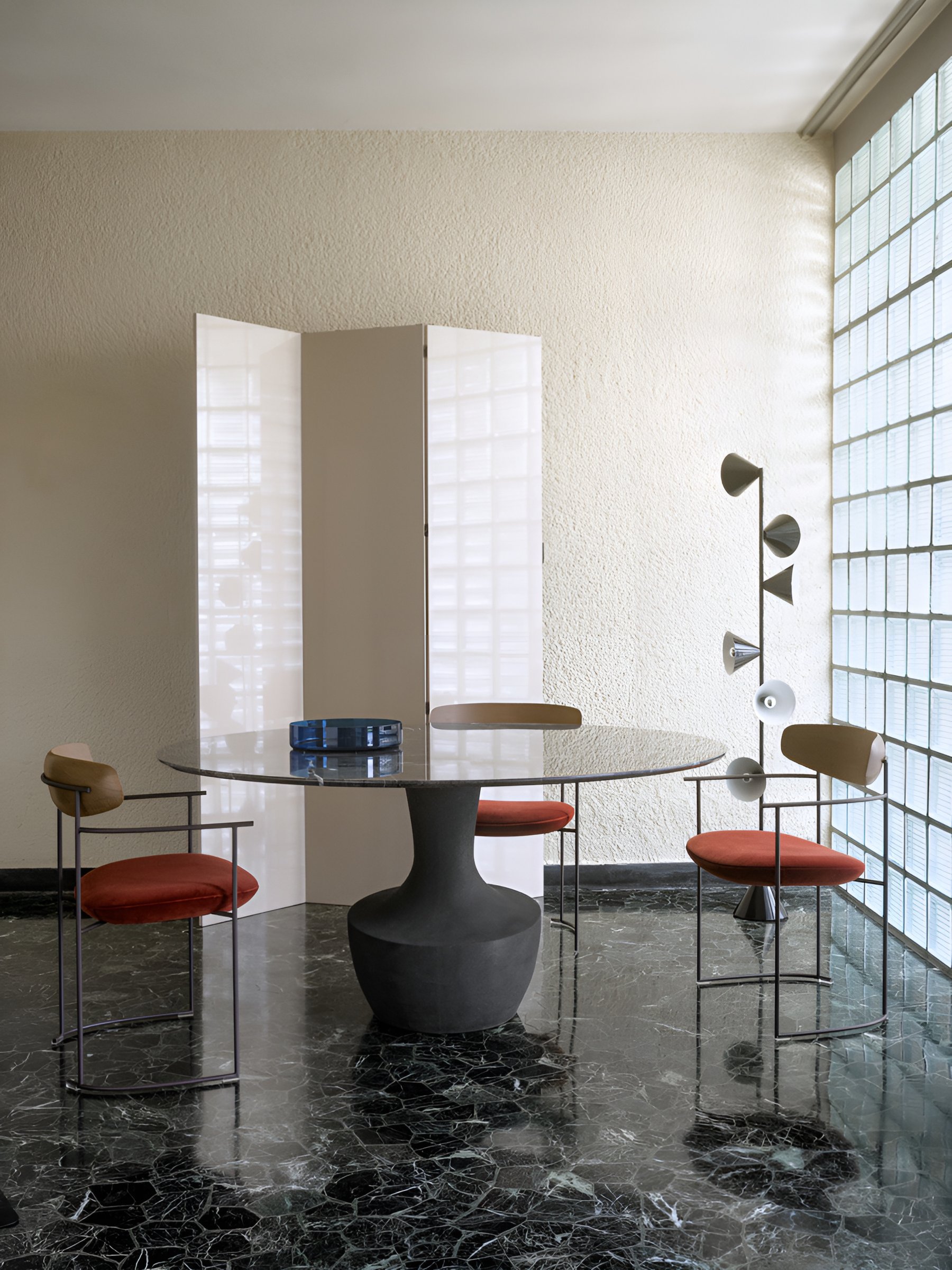 Круглый стол Anfora в двух размерах предлагается с новой отделкой как для основания, так и для столешницы.